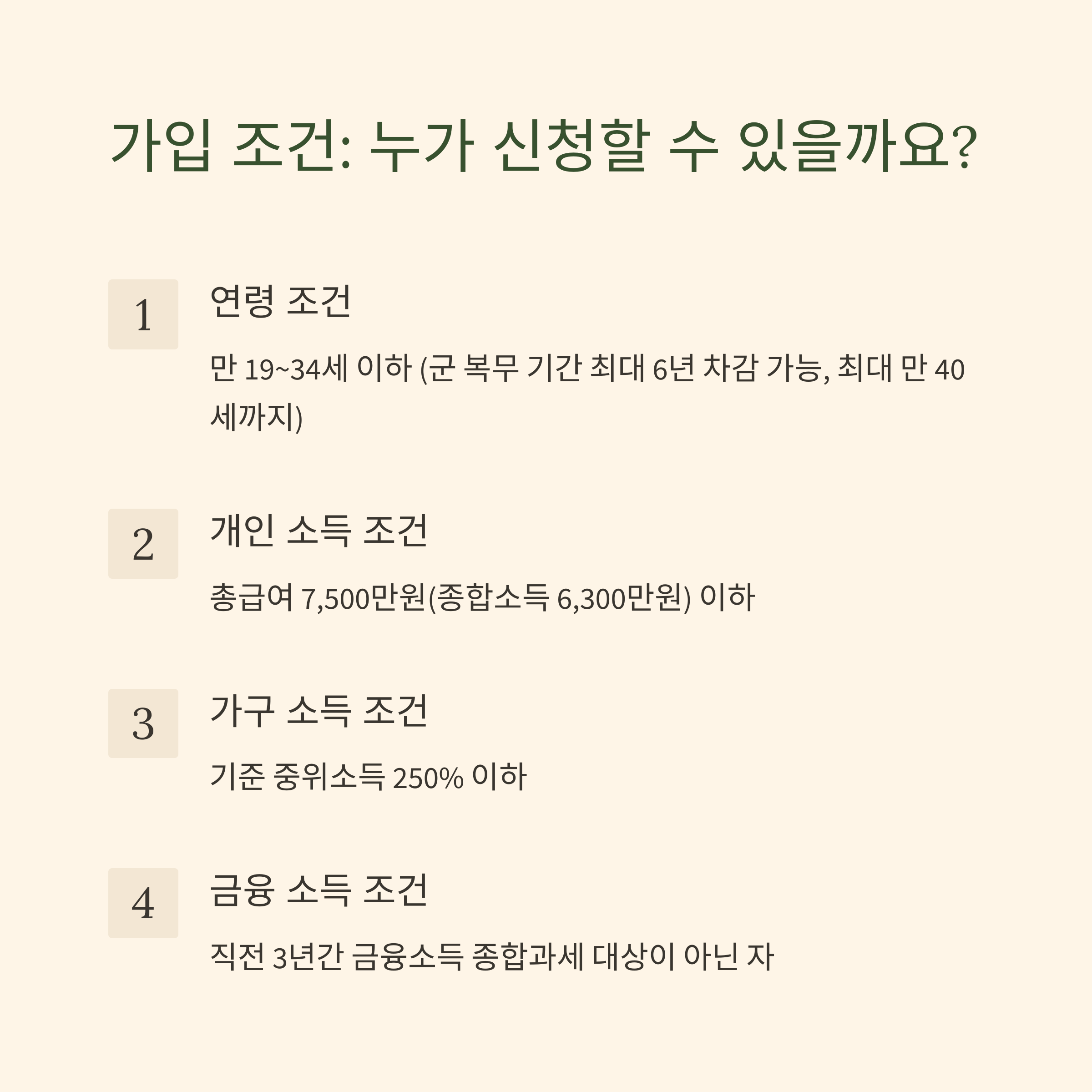 가입 가능 연령: 만 19~34세 이하 (군 복무 기간 최대 6년 차감 가능)