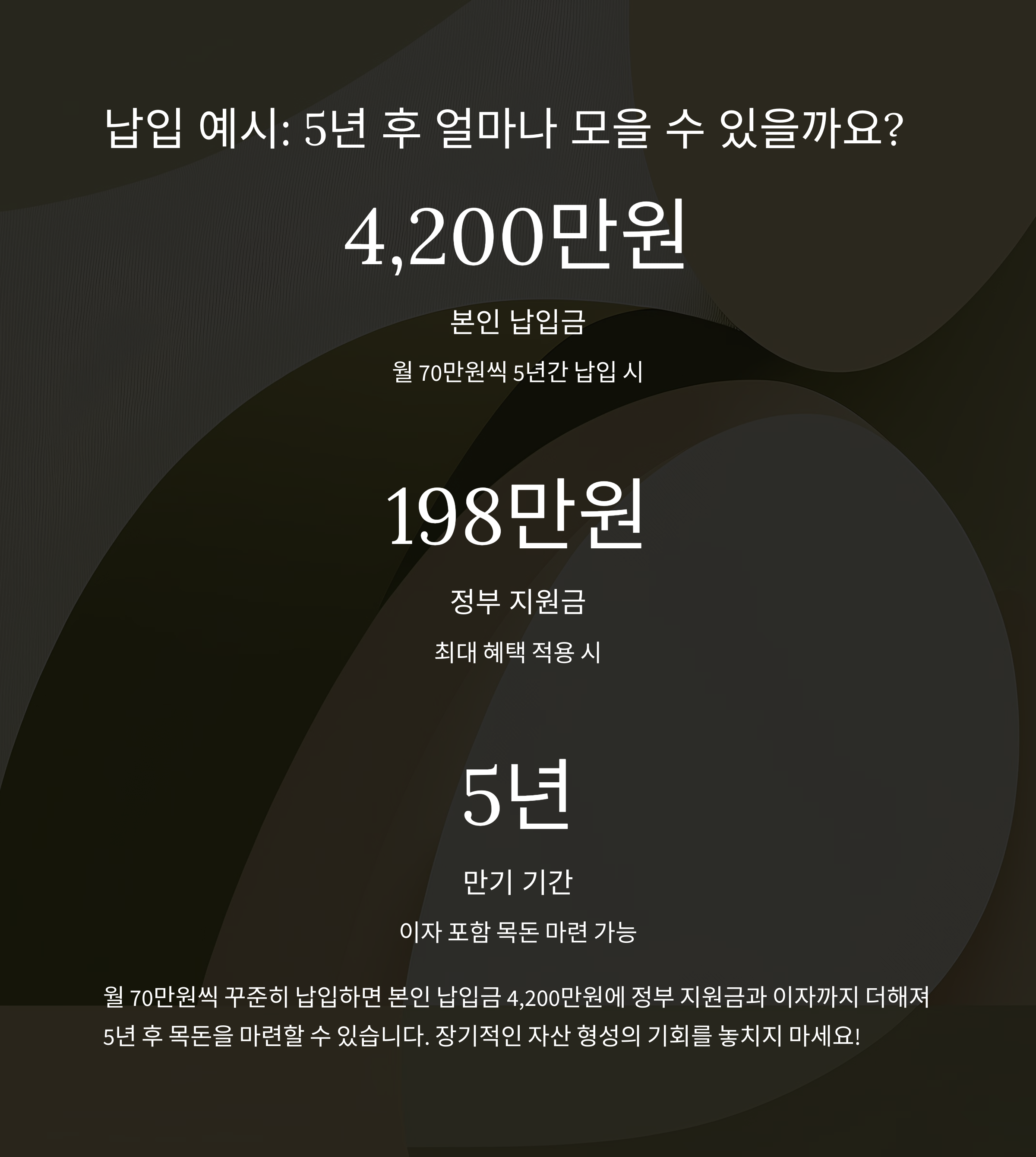 👉 본인 납입금 4,200만 원 + 정부 지원금 최대 198만 원 + 이자 포함 → 5년 후 목돈 마련!